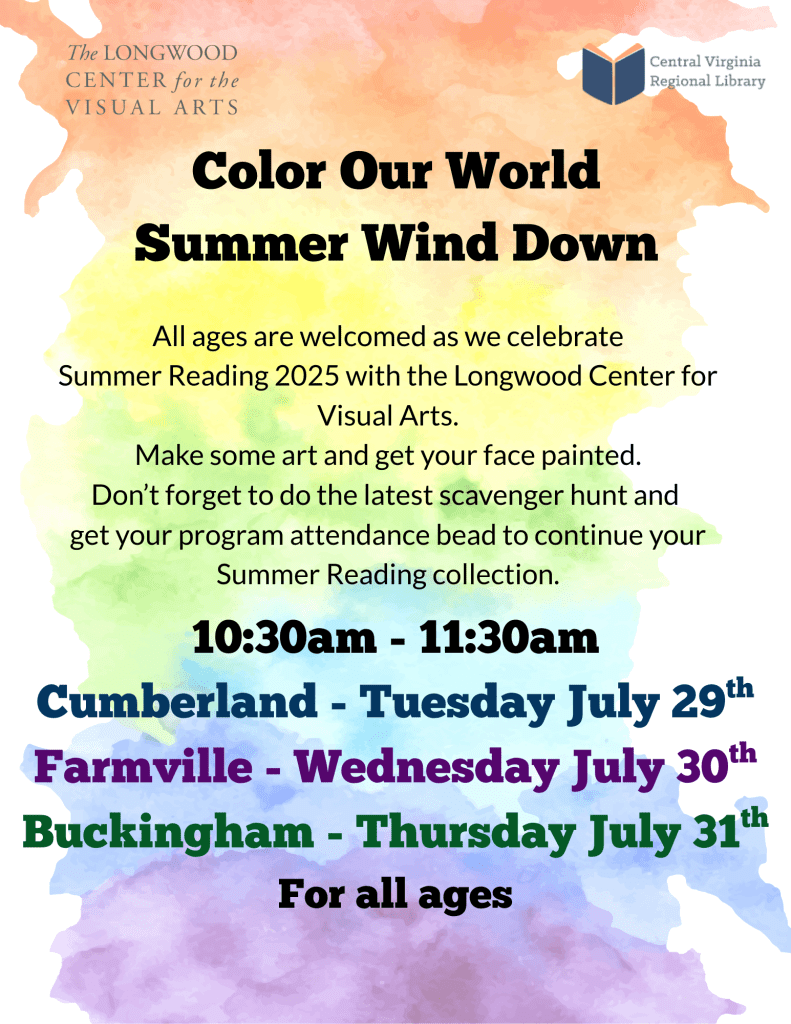 All ages are welcomed as we celebrate Summer Reading 2025 with the Longwood Center for Visual Arts. Make some art and get your face painted. Don’t forget to do the latest scavenger hunt and get your program attendance bead to continue your Summer Reading collection.