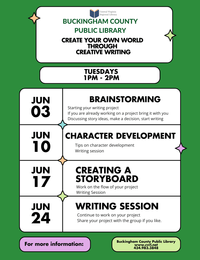 Create your own world through creative writing in these June workshop series. All ages welcomed.