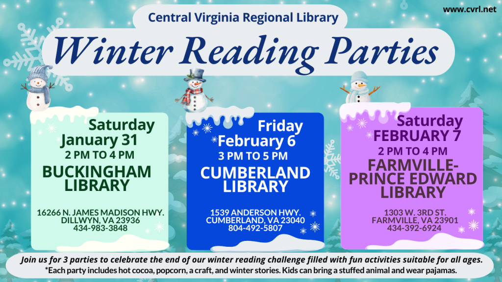 Winter Reading Challenge Raffles for each branch will be drawn at each branch’s party.